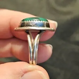 This elegant ring features malachite green stone set in a beautifully crafted sterling silver band.
