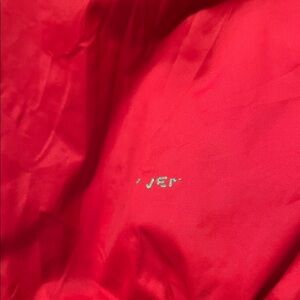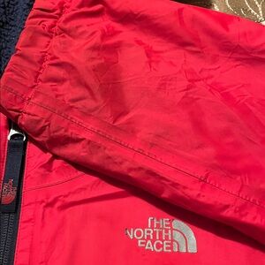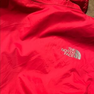 The North Face Jacket, red and dark blue with cozy inside. Ideal for outdoor activities.