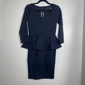 Alice + Olivia navy blue peplum sheath dress. This dress features a flattering peplum waistline and three-quarter length sleeves. A zippered back closure ensures a secure fit. The dress has a classic sheath silhouette with a structured peplum detail.