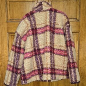 Cozy plaid teddy jacket by Knox Rose. Features cream, purple, and pink hues with purple pleather pocket and sleeve accents. Perfect for layering, slaying, and staying warm. p2p25", length 25", sleeve 19.5"/inseam 16". EUC