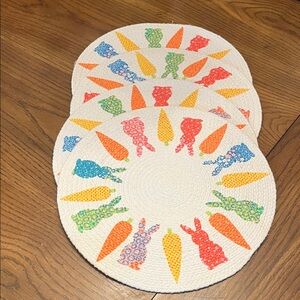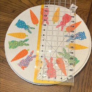 Round placemat featuring colorful bunnies and carrots. Perfect for adding a playful touch to your table setting. In great condition.
