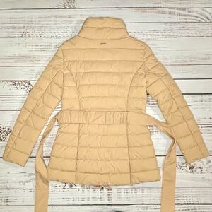 Chic and cozy puffer jacket. Ideal for cold weather. Features a stylish design with a stand collar, front zip closure, and a self-tie waist belt.