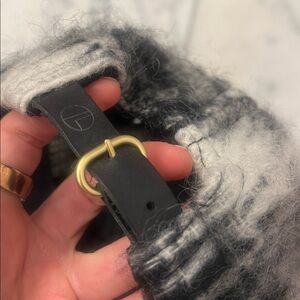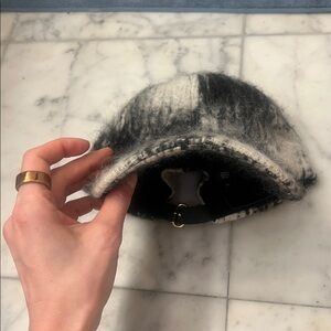 Elegant wool, mohair and nylon blend cap by Janessa Leone. Features a classic black, grey and white modern plaid-like design. Ideal for chic, everyday style. Adjustable buckle with gold toned buckle. Never worn