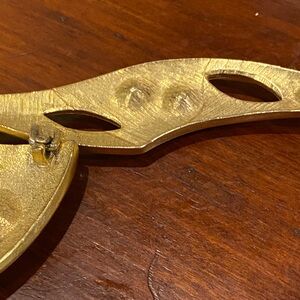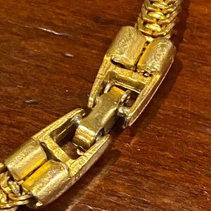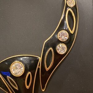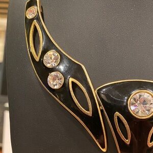This stunning Modernist necklace features a bold black enameled design accented with gold trim and sparkling stones. Perfect for adding a touch of elegance to any outfit. Fold over clasp. Thick herringbone chain.
