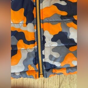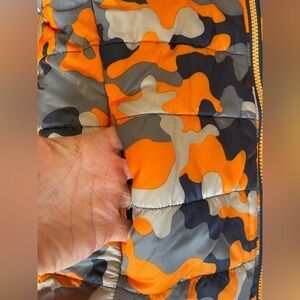 Cozy fleece jacket with camouflage lining. Features a mix of orange, blue, and gray.