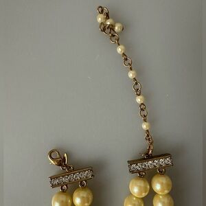 Beautiful Vintage Avon statement necklace featuring creamy faux pearls in a layered double-strand design, accented with a sparkling pavé crystal oval centerpiece. Finished with gold-tone hardware and an adjustable chain closure for a comfortable, customizable fit. Ideal for weddings, cocktail parties, holidays, or elevating everyday outfits. A stunning vintage piece that adds sophistication and glamour to any jewelry collection.