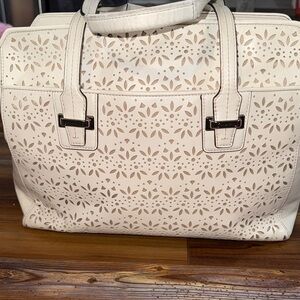 Design: A light-colored leather exterior with a distinctive eyelet cutout pattern.