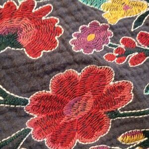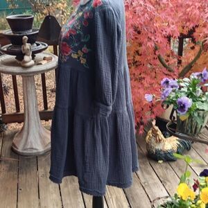 This textured fabric is cool and light. Multi-colored embroidery on the front, seam under chest. Bracelet length sleeves. Size S measures 40 at chest, 38 under chest, full skirt with a deep ruffle. 33 long from shoulder to hem. A cutie.
