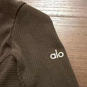 Elevate your workout-to-wear-out wardrobe with the Rise-Up Long Sleeve Bodysuit in sleek Espresso. This form-fitting piece, from Alo Yoga, blends performance and poise with figure-hugging fabric that moves with you. Its tailored design and subtle yet flattering contours offer an all-day versatile wear, complete with a convenient snap closure for ease. Perfect for layering or making a statement solo, it’s a must-have for the fashion-forward fitness enthusiast. Features two snap bottom closure and 3/4 zip neck. Turtleneck. Ribbed detail. Thumb holes on sleeves. EUC