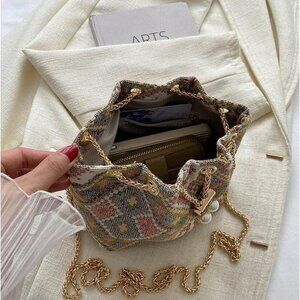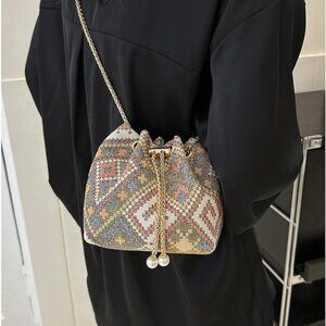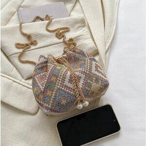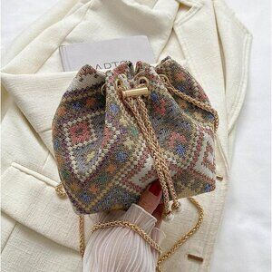 Features: Soft, lightweight polyester bag with a playful plaid pattern. Features a drawstring closure, a boho-inspired metal shoulder strap, and a bucket shape that’s easy to carry. Perfect for adding a pop of color to any outfit.