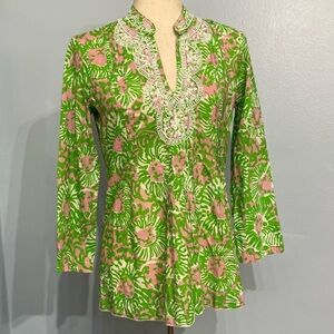 Lilly Pulitzer Print Beaded Tunic. Size XS. Approximate measurements laying flat are 17” pit to pit and 26” back neck to hem. 100% cotton. In good preowned condition.