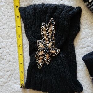 Stay warm and chic with these knit black gloves featuring gray patterns. Lined and thicker. The matching headband is adorned with a decorative beaded embellishment. Comes with a lavender Cosmetic Pouch. Great for travel and airplanes.