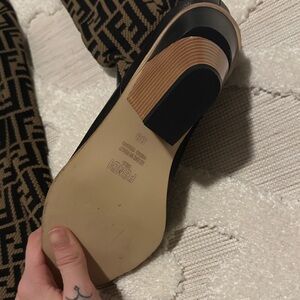 Elegant Fendi boots with iconic pattern. Black leather with tan accents. Perfect for stylish outings.
