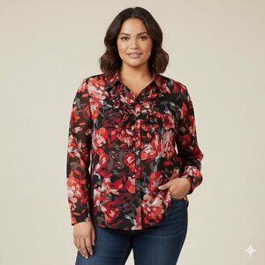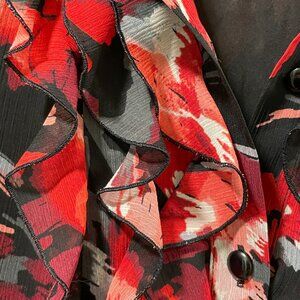 NWT JM COLLECTIONS "Savoir Faire" Ruffle Front Blouse Red/Black Floral Women 16