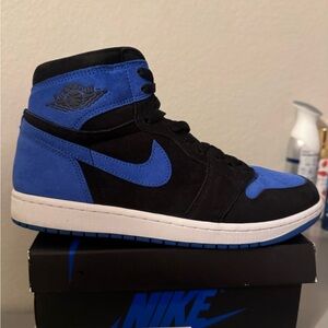 Elevate your look with these Nike Air Jordan 1 Retro High sneakers. Bold black and blue design. Iconic style and comfort.