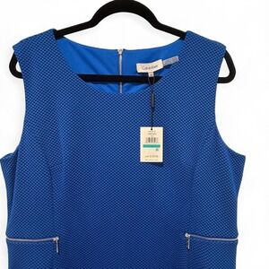 Stunning Calvin Klein sheath dress in vibrant royal blue, brand new with tags! Features size 16, sleeveless design, round neckline, textured jacquard fabric with subtle pattern, decorative front zipper pockets with silver hardware, back zip closure, shift silhouette, and stretch polyester-elastane blend (96% polyester, 4% elastane) with full polyester lining for comfortable fit. Perfect for office wear, weddings, cocktail parties, special events, or professional occasions. Bold blue color makes a statement. Originally $129.50. Quality Calvin Klein designer styling.