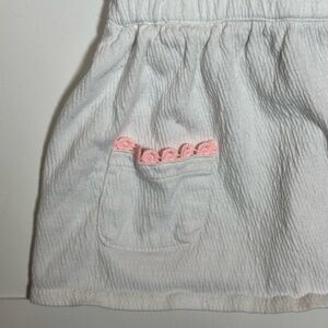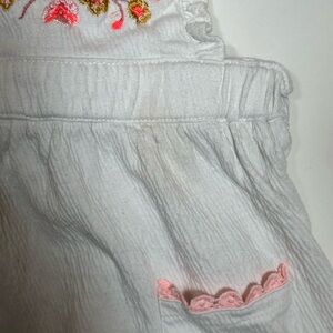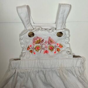 Charming white dress with floral embroidery. Features pink and yellow accents. Perfect for casual outings. Good pre-owned condition, with a faint discoloration spot above the right pocket, as shown in last photo. Barely noticeable when worn. Size 12 months.
