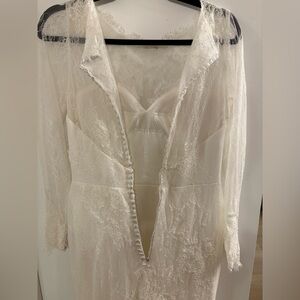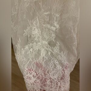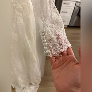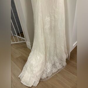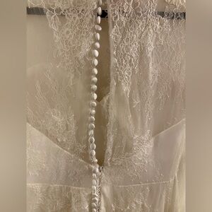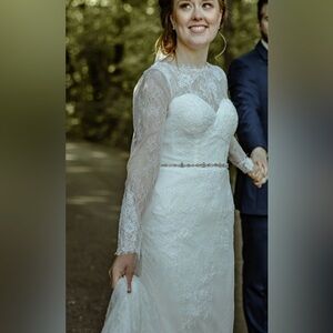 Christina Wu #15622 in Ivory. This Chantilly lace gown features a romantic, illusion, bateau neckline and long sleeves. Lace appliques trail down the bodice and trickle to the skirt. The waist is finished with a delicate sequin and beaded belt. The illusion, lace back is finished with covered buttons.
