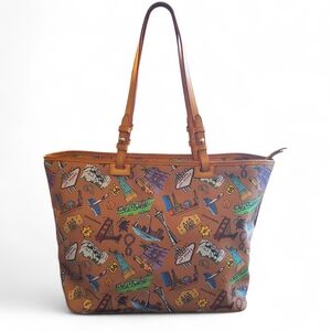 This Dooney & Bourke It Collection tote features the beloved Americana Landmark print, showcasing iconic U.S. travel symbols in a colorful pop-art design. Durable coated canvas with leather trim, a secure zip closure, and a spacious interior make it both collectible and practical. A standout piece for Dooney fans and vintage handbag collectors alike.