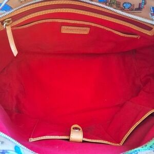 Interior: Red fabric lining with Dooney & Bourke Inc. label + serial number tag, zip pocket, slip pocket, and key clip