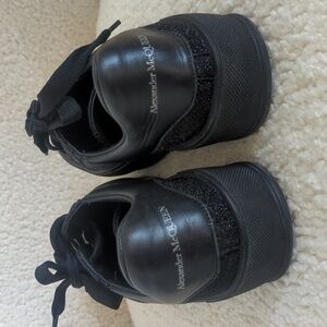Alexander McQUEEN Men's Tread Slick Soft Glitter Low Top Sneakers. Fits true to size. Round rubber cap toe. Lace up. Soft glitter fabric upper. Grommet details at side. Leather detail at heel. Textured rubber wraparound detail. Logo pull tab at heel