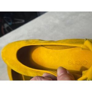 Beautiful nubuck in a golden yellow color. Nice for fall or spring! Somewhere between a platform and a flat. Rubber soles. Slip on. Rare color combo!