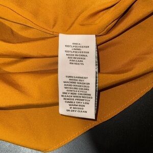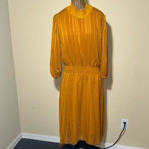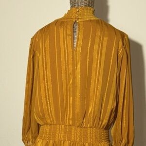 Nanette Lepore Yin Shadow Dress. Mustard gold with stripes in fabric, smocked waist and collar. Back button neck details, slip. 100% polyester. Good condition! Step out in style with this elegant mustard dress, perfect for any occasion. Its chic design and vibrant color make it a must-have in your wardrobe.