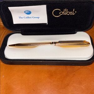 Authentic Colibri writing pen by The Colibri Group, featuring a gold-tone textured barrel and sleek, balanced design. Pen is in excellent condition.