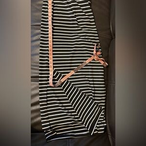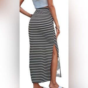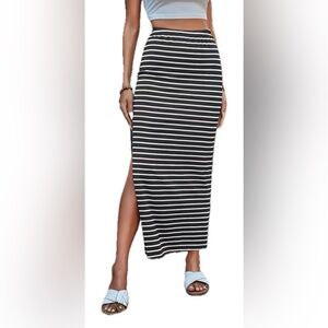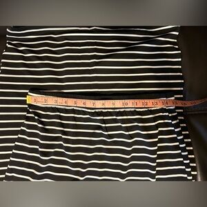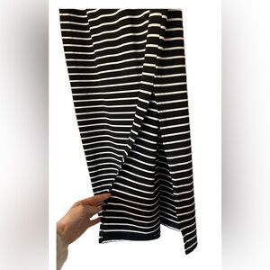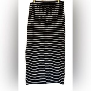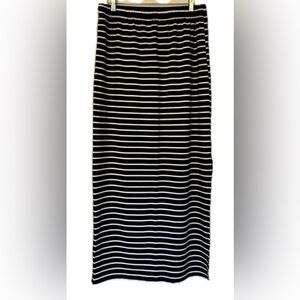 Black and White striped Skirt. Size L. Stretch material. Form fitting. Slip on one side. Elastic waist band. Comfy. Small snag noted. Great condition otherwise. See pictures for details.