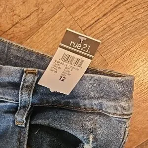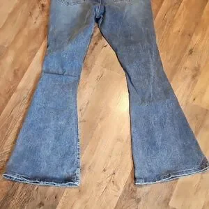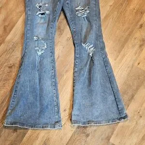 Stylish flare jeans with distressed details. Wide leg design. Perfect for casual wear.