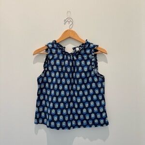 J. Crew printed linen blend ruffle neck top blouse sleeveless blue Size S
