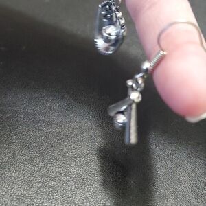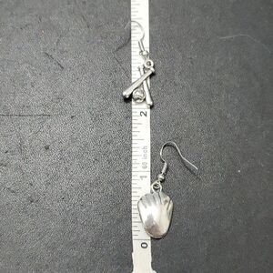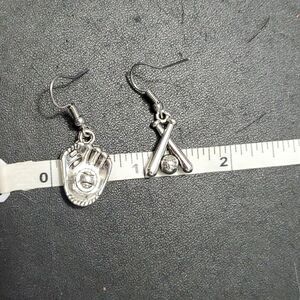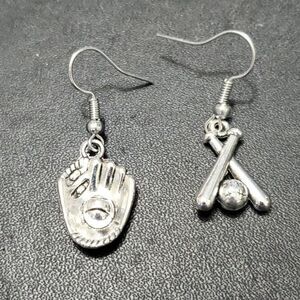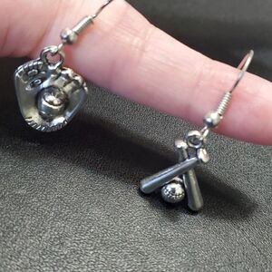 Adorable silver colored baseball themed earrings are a dangling glove and ball and dangling bats and a ball.