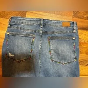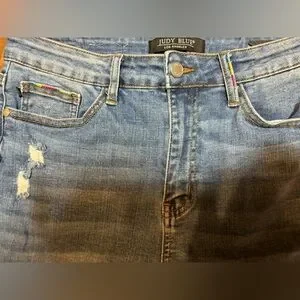 Judy Blue Skinny Fit Jeans 11 / 30 Distressed Rainbow Embroidered Raw Hem