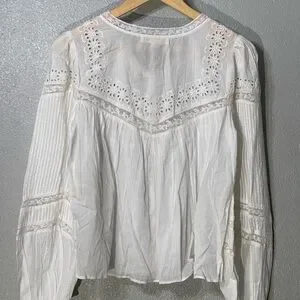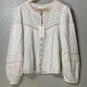 Charming white blouse with eyelet details. Button-down front. Delicate lace accents. Perfect for casual elegance.