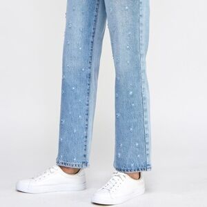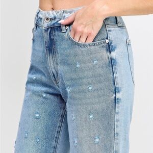 Give your denim collection a stylish edge with these high-rise dad jeans featuring a unique fringe waistband detail. Designed with a relaxed, vintage-inspired silhouette, they offer a structured front for a classic denim look and a stretch back for added comfort. The high-rise waist flatters your figure, while the fringe accent adds a playful, fashion-forward twist. Perfect for effortless everyday styling, these jeans blend classic and contemporary elements seamlessly. Pair them with cropped tops, tucked-in tees, or statement outerwear for versatile wear.
