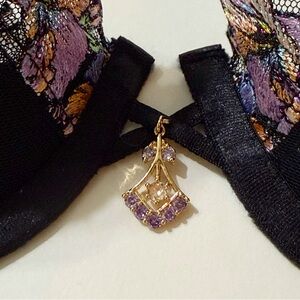 • adjustable spaghetti straps with gold medal diamond purple jewel detail