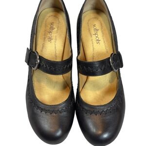 Softspots black leather Mary Jane shoes with a 2.5" wedge heel and platform sole. Adjustable strap with round buckle and decorative stitching. Cushioned insole for all-day comfort. Size 8.5. Style CAT110.