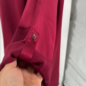 Chic deep red blouse with a relaxed fit. Features a round neckline and long sleeves. Ideal for versatile styling.