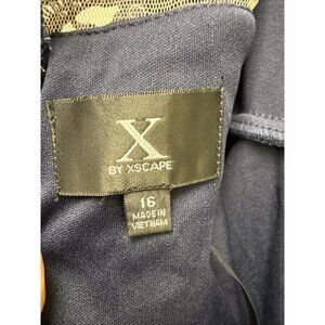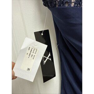 XSCAPE Size 16 Navy Metallic Lace Sleeve Chiffon Ruffled Cascade Gown Dress New