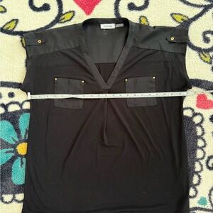 This stylish and versatile Calvin Klein top is a capsule wardrobe essential. Features a flattering V-neck, cap sleeves, and utilitarian details like buttoned shoulder tabs and chest pockets accented with gold-tone studs.
