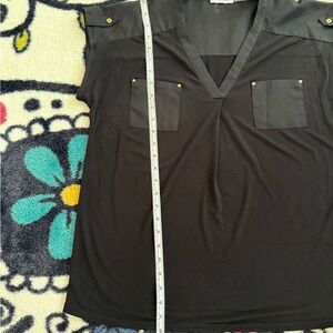 Utility Utilitarian V-Neck Cap Sleeve Sleeveless Workwear Career Business Casual Office Professional Polished Chic Classic Designer Gold Detail Black Blouse Flowy Drapey Layering Spring Summer Fall