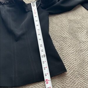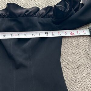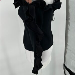Cinq à sept black off-shoulder top with dramatic ruffle sleeves and a structured, fitted silhouette. Elegant triacetate blend fabric with smooth lining for a polished look. Features a hidden back zipper and subtle interior support strap for secure wear. Ideal for cocktail, date night, evening, holiday, or special occasion styling.
