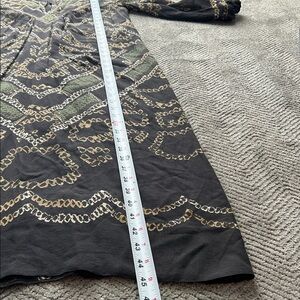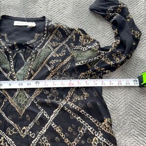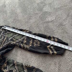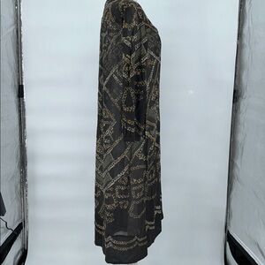 Chic long sleeve dress with a black base. Features intricate gold patterns. Ideal for stylish outings.
