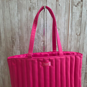 This is a Kate Spade New York tote bag and matching cosmetic bag set. The tote bag featuring a quilted design with horizontal stitching. It has two shoulder straps and a small Kate Spade logo tag. The cosmetic bag is a half-moon shape with a zipper closure and matching quilted design. Both items are made of a bright pink material and are in new condition without tags or box.