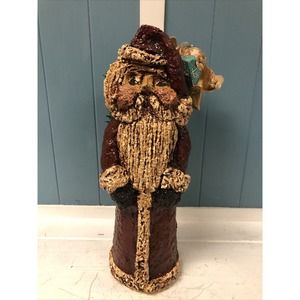 This vintage handmade paper mache figurine features a jolly Old World Santa Claus, perfect for your Christmas decor. The figurine stands at 15 inches tall and is made of mixed materials, including paper. The textured finish and painted details give it a unique and charming look.