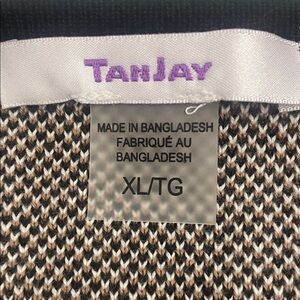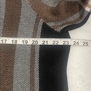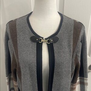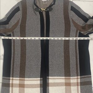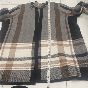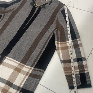 Tan jay black, tan, and cream plaid long cardigan sweater with a leather toggle or buckle closure.