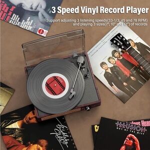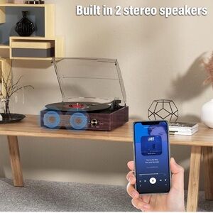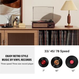 Enjoy your favorite vinyl records with this stylish vintage turntable. The elegant brown finish and clear lid add a touch of class to any room. Perfect for music enthusiasts.