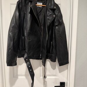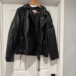 Chic faux leather jacket with sleek zipper accents. Adjustable belted waist for a custom fit.