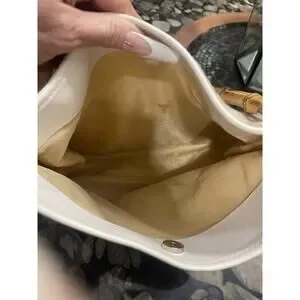 The brown bamboo handle and strap add to the bag's nature-themed design, and the silver hardware provides a touch of elegance. The beige exterior and lining color complement each other, making this bag a stylish addition to any outfit. The bag comes with a matching pouch for extra organization.