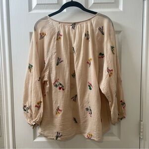 SALE! Madewell Botanical Embroidered Gauzy Cotton Tie-Neck Peasant Top Small. Made of crinkled cotton gauze, this breezy peasant top has balloon sleeves, a tie at the neck and embroidery inspired by old-school botanical drawings—we give it two (green) thumbs up. Slightly oversized fit. No flaws noticed gently used. Images of item being worn are stock photos to give an idea of style and fit. Comes from a clean and loving home!